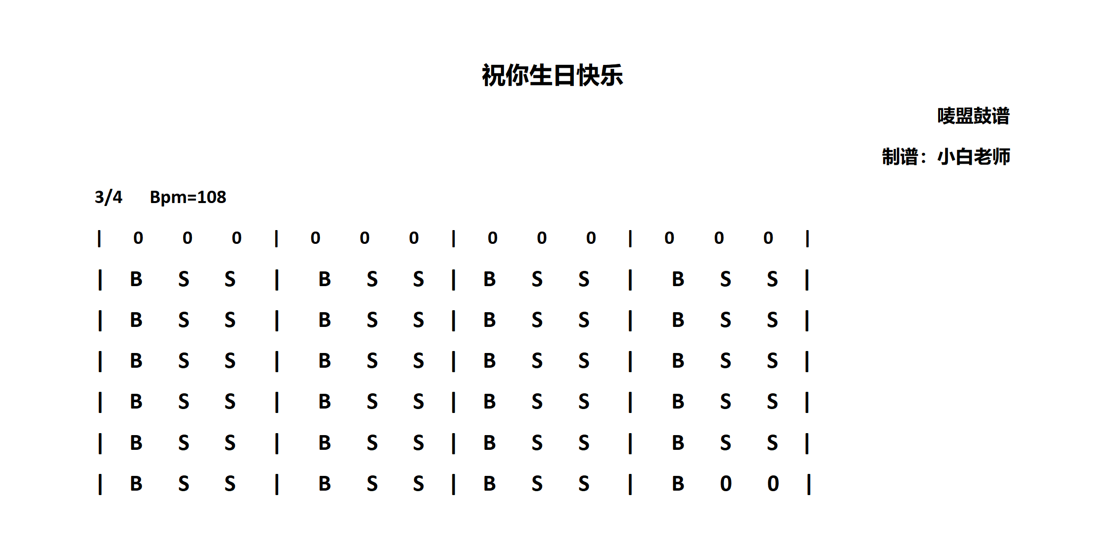 《祝你生日快乐》是儿歌演唱的一首歌曲,拍号为4/4拍,这份非洲鼓谱共有一张高清图谱,图谱由 @苏小白 编配上传。