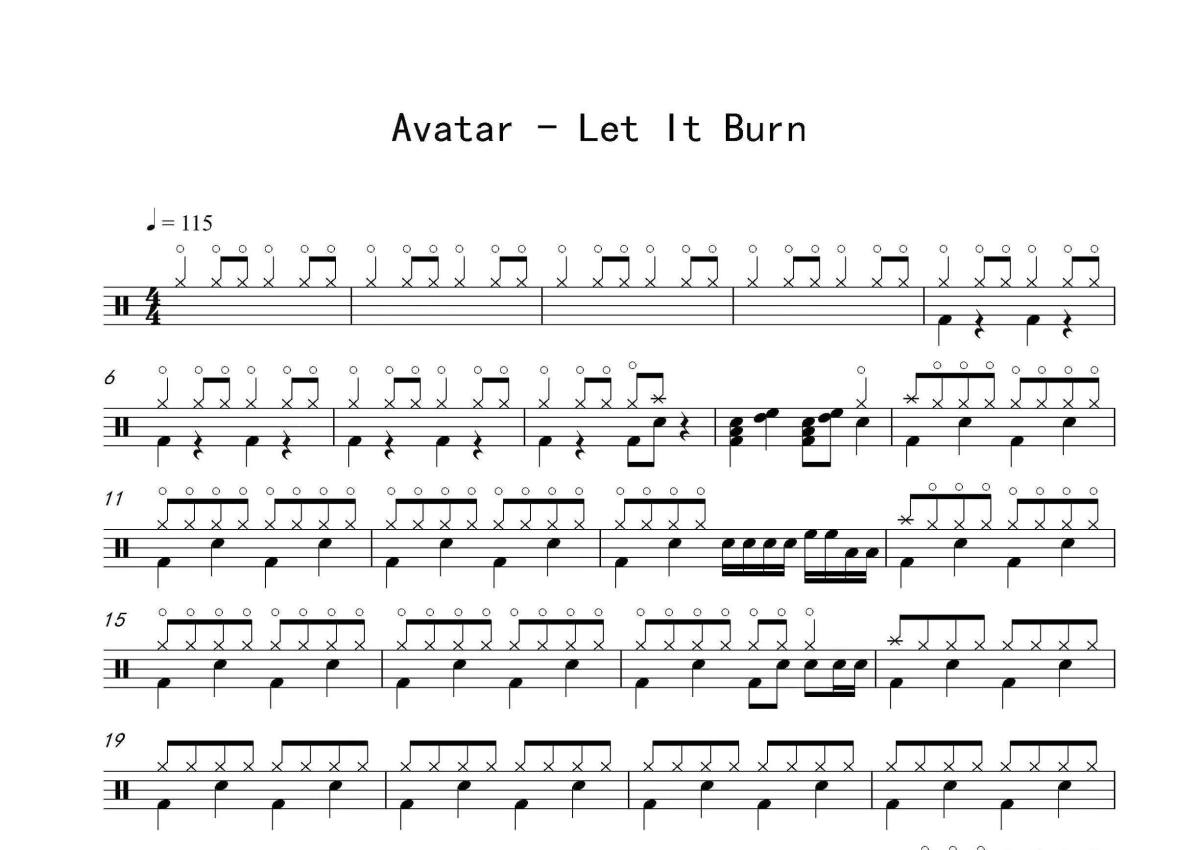 《Let It Burn》是Avatar演唱的一首歌曲,拍号为4/4拍,歌曲速度为每分钟115拍,这份架子鼓谱共有两张高清图谱,图谱由 @音符喷血者 编配上传,图谱使用五线谱编配,使用这份Let It Burn架子鼓谱,你将能够轻松地敲打出这首Avatar的Let It Burn,快来尝试吧。