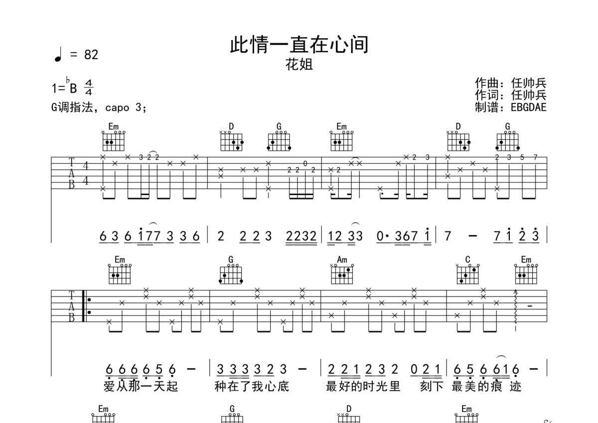 《此情一直在心间》是花姐演唱的一首歌曲,本吉他谱采用的是G调指法编配,这份吉他谱共有两张高清图谱,图谱由 @EBGDAE 编配上传,图谱使用六线谱编配,包含吉他和弦指法、简谱以及歌词部分,使用这份此情一直在心间吉他谱,可以让你更加方便地掌握这首歌曲的弹唱技巧,快来尝试吧。2张谱,免翻页排版设计。物美价廉,放心选购!加油!。