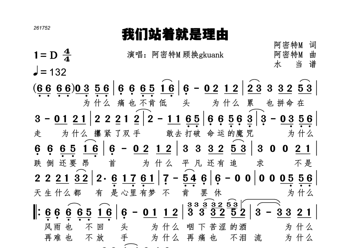 《我们站着就是理由》是阿密特M&顾换gkunk演唱的一首歌曲,拍号为4/4拍,歌曲速度为每分钟132拍,这份简谱共有两张高清图谱,图谱由 @水当 编配上传。