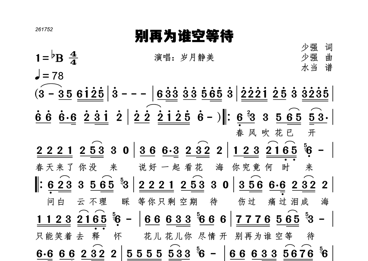 《别再为谁空等待》是岁月静美演唱的一首歌曲,拍号为4/4拍,歌曲速度为每分钟78拍,这份简谱共有一张高清图谱,图谱由 @水当 编配上传。