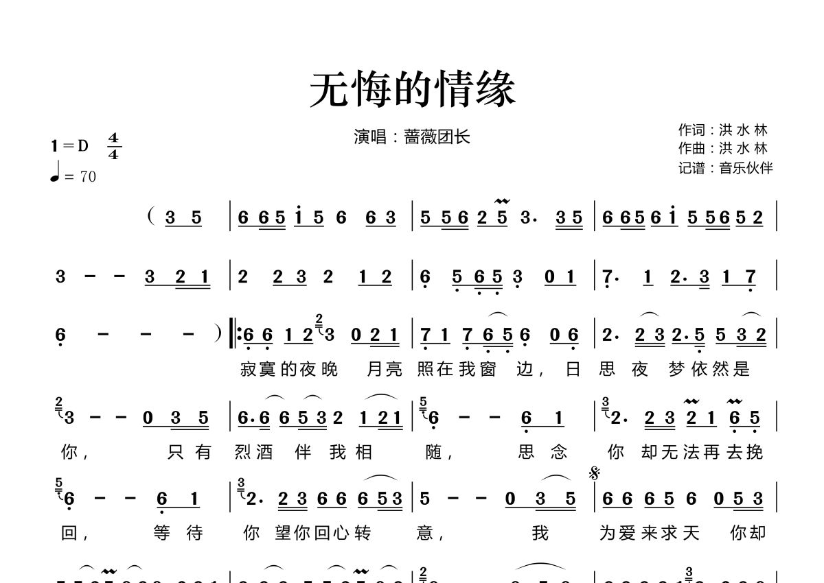 《无悔的情缘》是蔷薇团长演唱的一首歌曲,这份简谱共有一张高清图谱,图谱由 @音乐伙伴 编配上传。