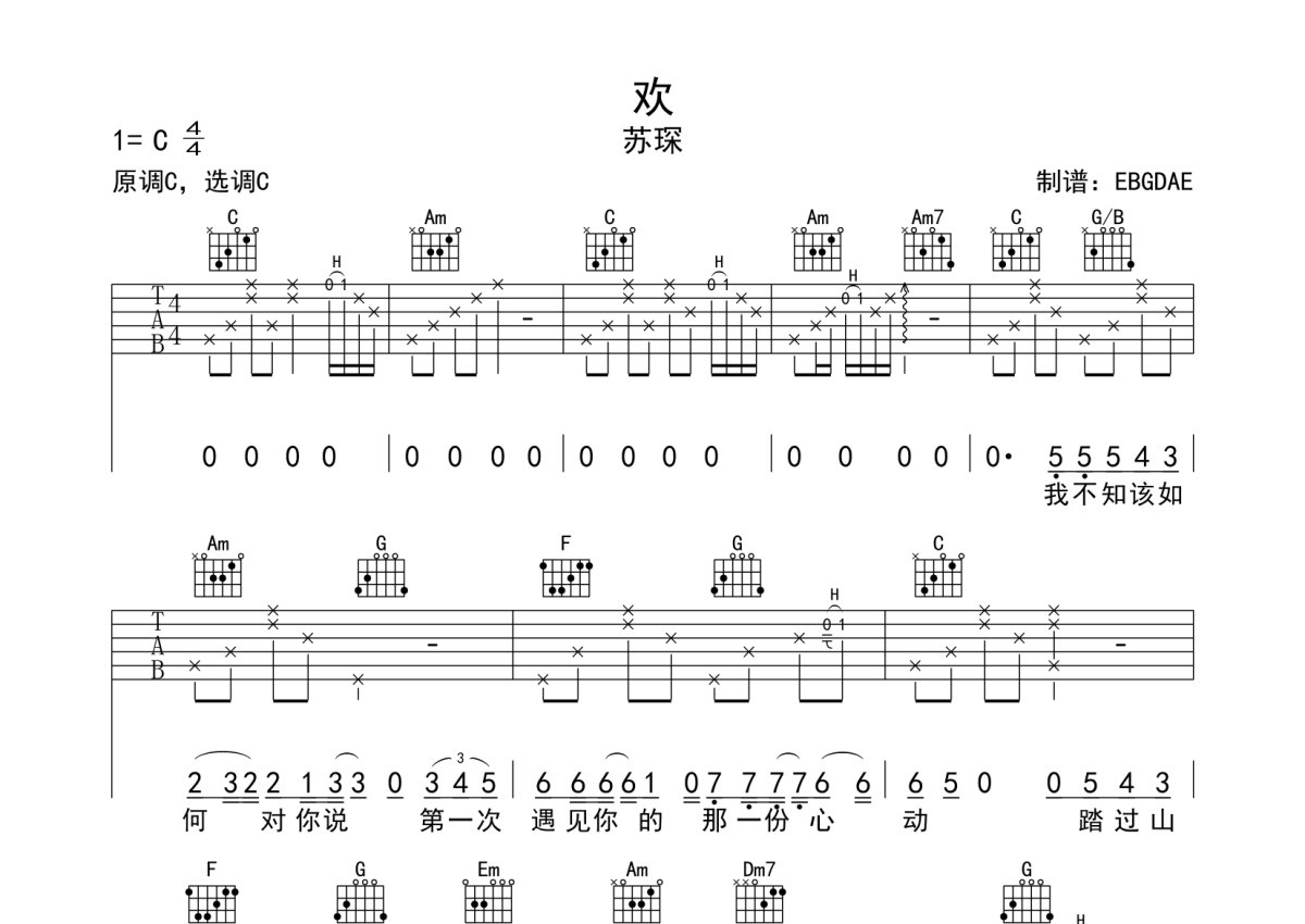 苏琛《欢》吉他谱 - C调弹唱六线谱