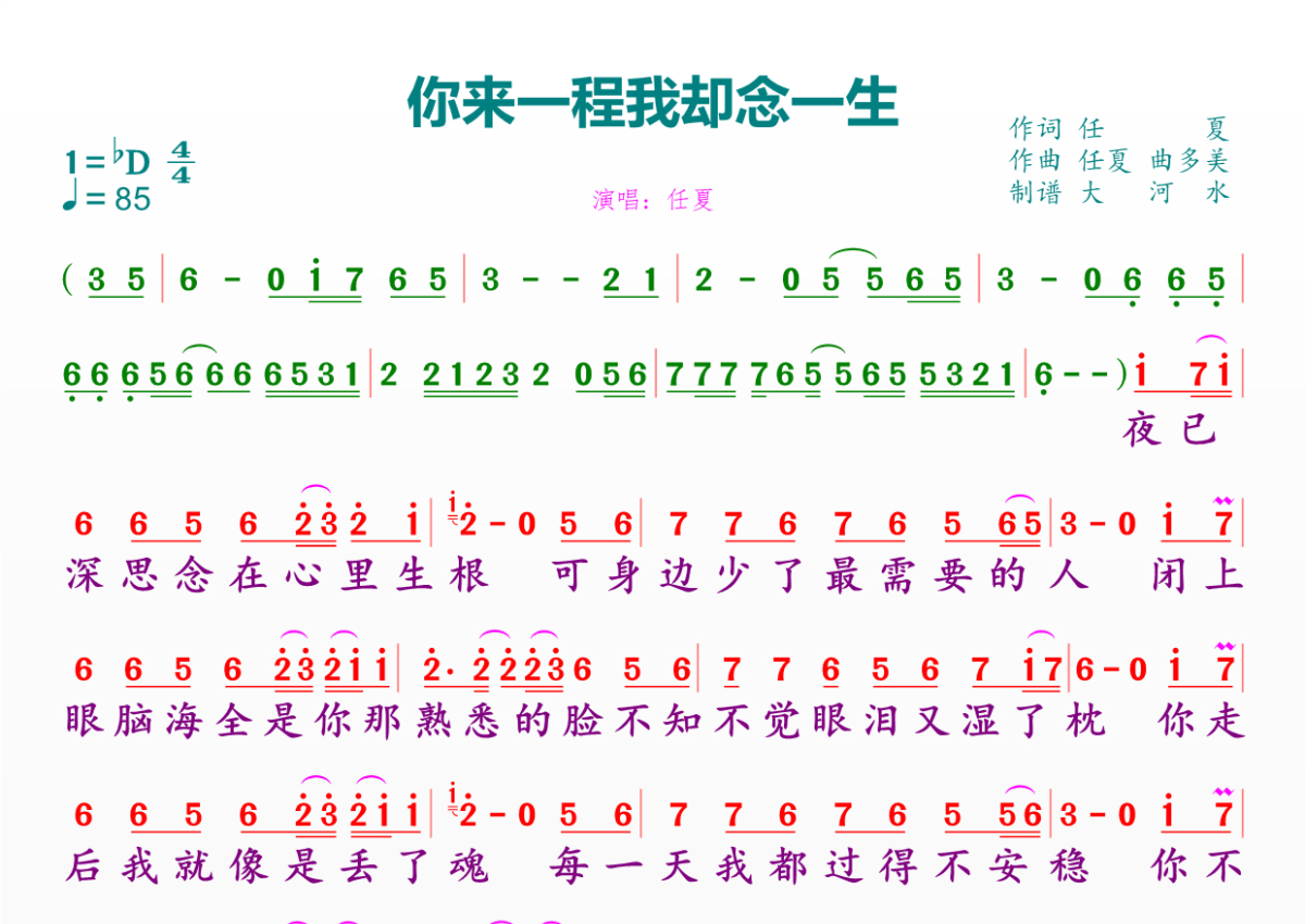 你来一程我却念一生简谱 - 任夏演唱