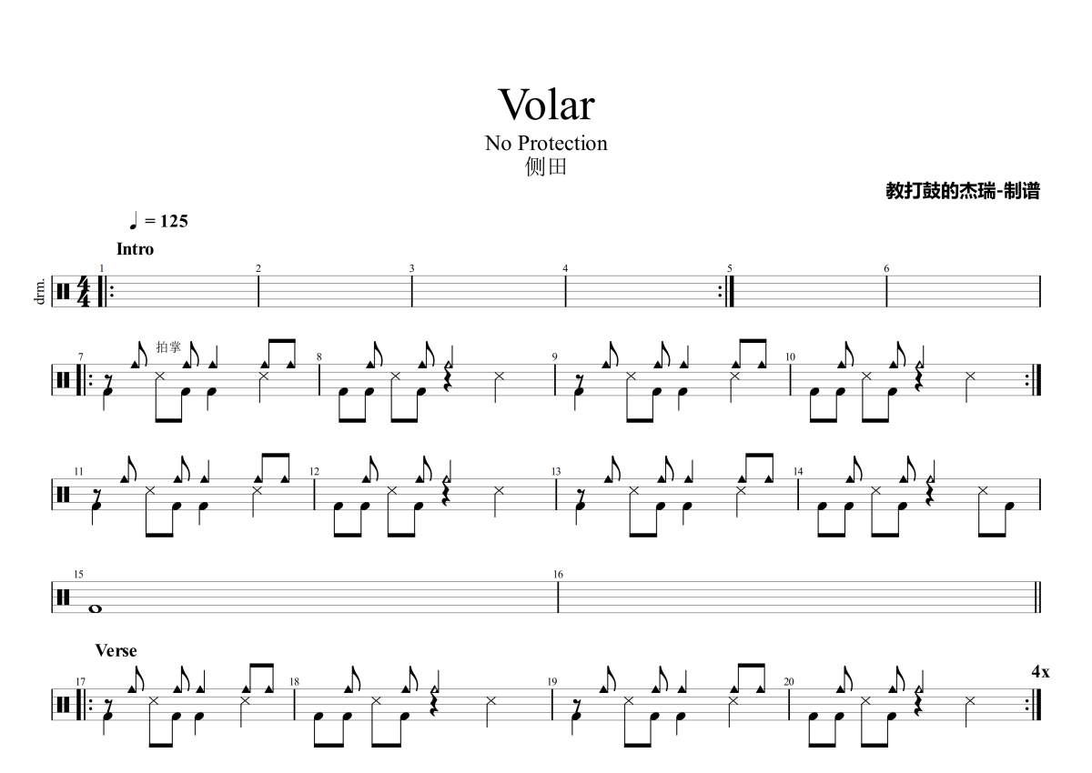 《Volar》是侧田演唱的一首歌曲,拍号为4/4拍,歌曲速度为每分钟125拍,这份架子鼓谱共有两张高清图谱,图谱由 @Jerry 编配上传,图谱使用五线谱编配,使用这份Volar架子鼓谱,你将能够轻松地敲打出这首侧田的Volar,快来尝试吧。