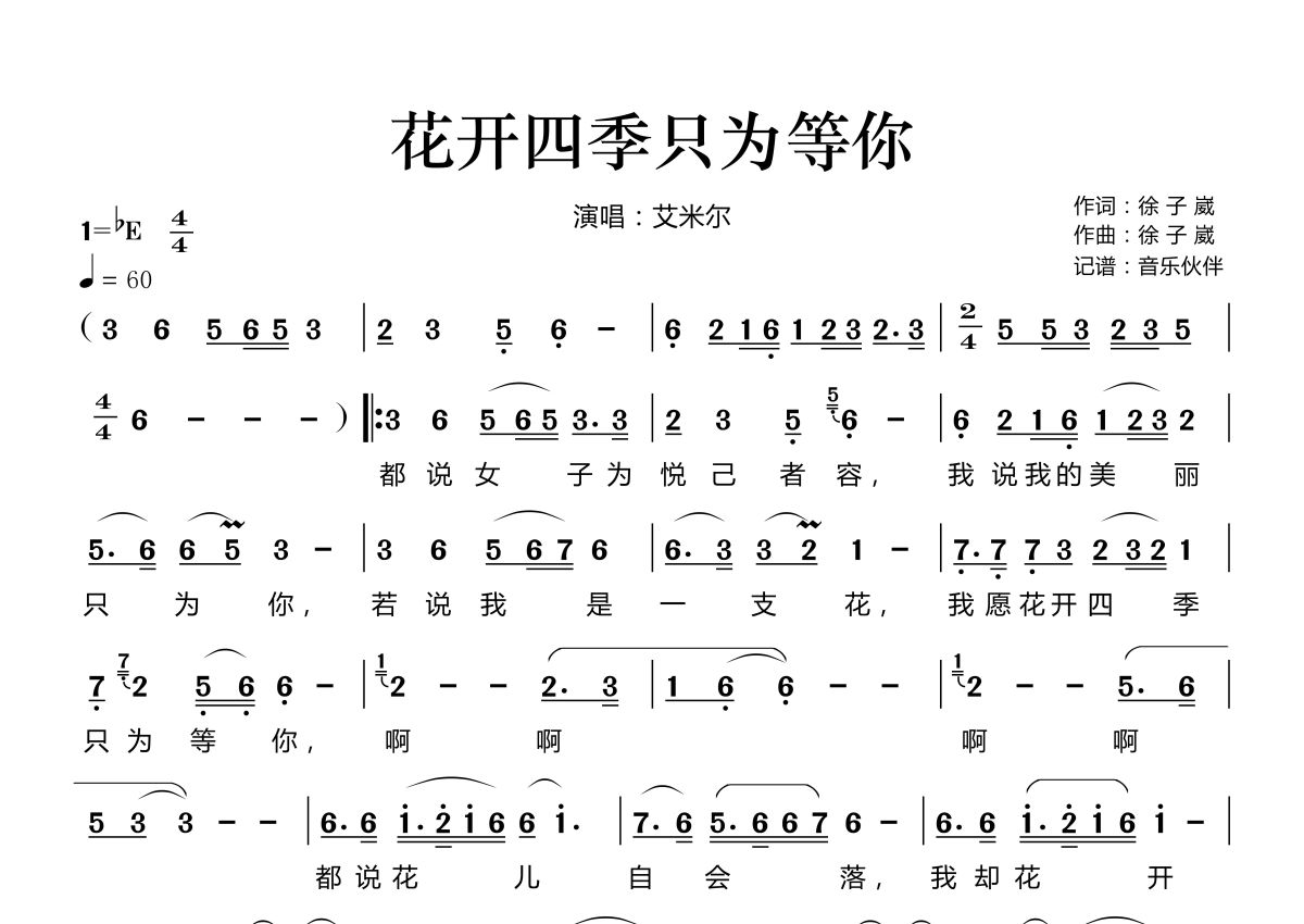 花开四季只为等你简谱 - 艾米尔演唱