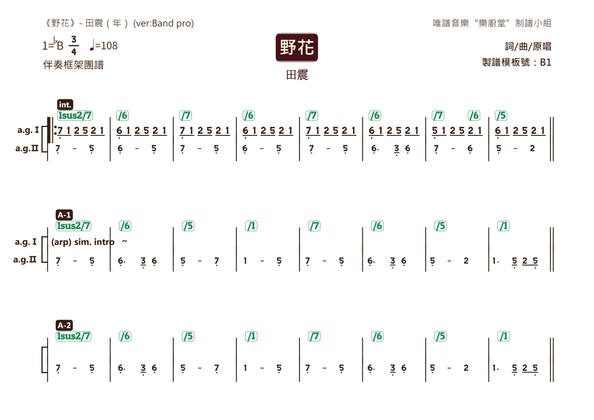 《野花》是田震演唱的一首歌曲,基础框架版团谱,这份乐队总谱共有两张高清图谱,图谱由 @唯谱音乐"乐厨堂"发布小组 编配上传。