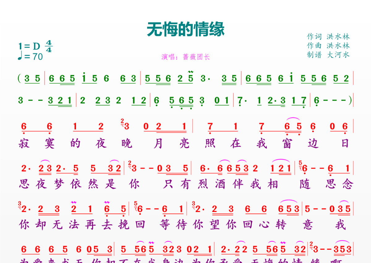 《无悔的情缘》是蔷薇团长演唱的一首歌曲,拍号为4/4拍,歌曲速度为每分钟70拍,这份简谱共有一张高清图谱,图谱由 @临海雪原 编配上传。