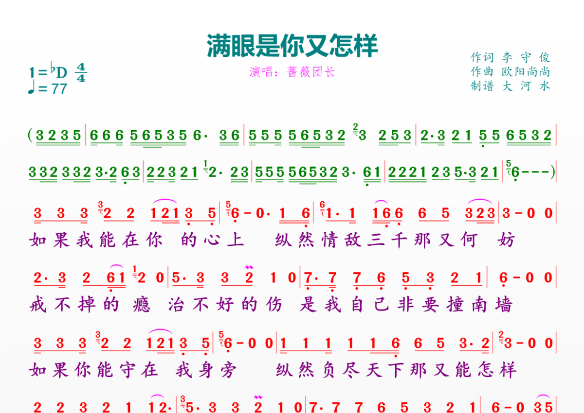 《满眼是你又怎样》是蔷薇团长演唱的一首歌曲,拍号为4/4拍,歌曲速度为每分钟77拍,这份简谱共有一张高清图谱,图谱由 @临海雪原 编配上传。