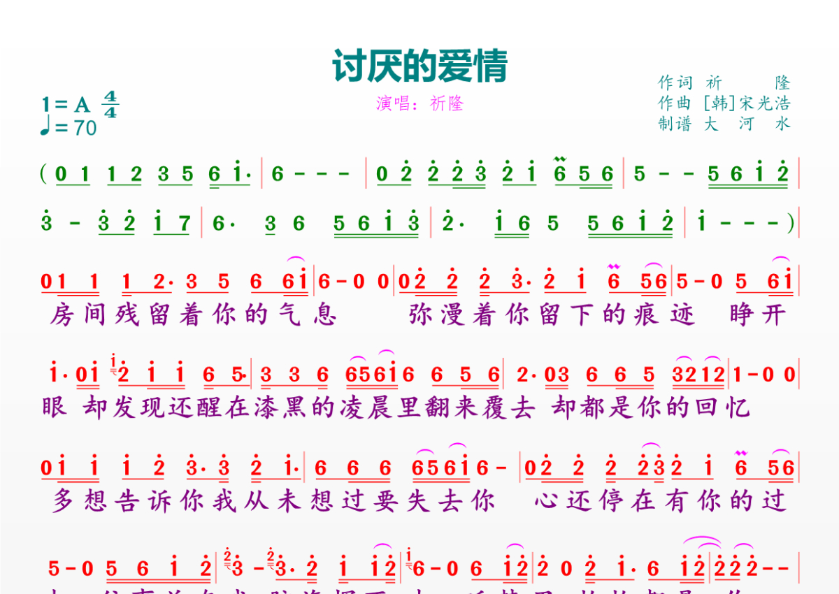 《讨厌的爱情》是祈隆演唱的一首歌曲,拍号为4/4拍,歌曲速度为每分钟70拍,这份简谱共有一张高清图谱,图谱由 @临海雪原 编配上传。