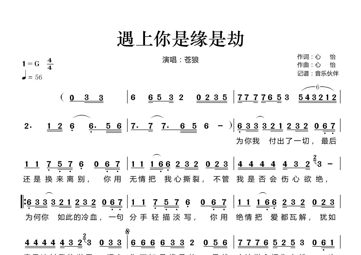 《遇上你是缘是劫》是苍狼演唱的一首歌曲,拍号为4/4拍,歌曲速度为每分钟56拍,这份简谱共有一张高清图谱,图谱由 @音乐伙伴 编配上传。