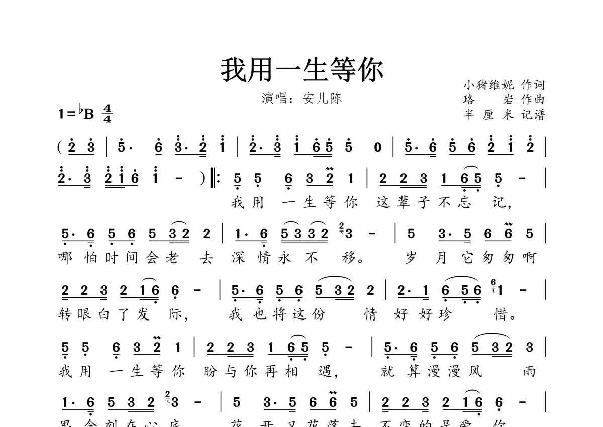 《我用一生等你》是安儿陈演唱的一首歌曲,这份简谱共有一张高清图谱,图谱由 @半厘米 编配上传。