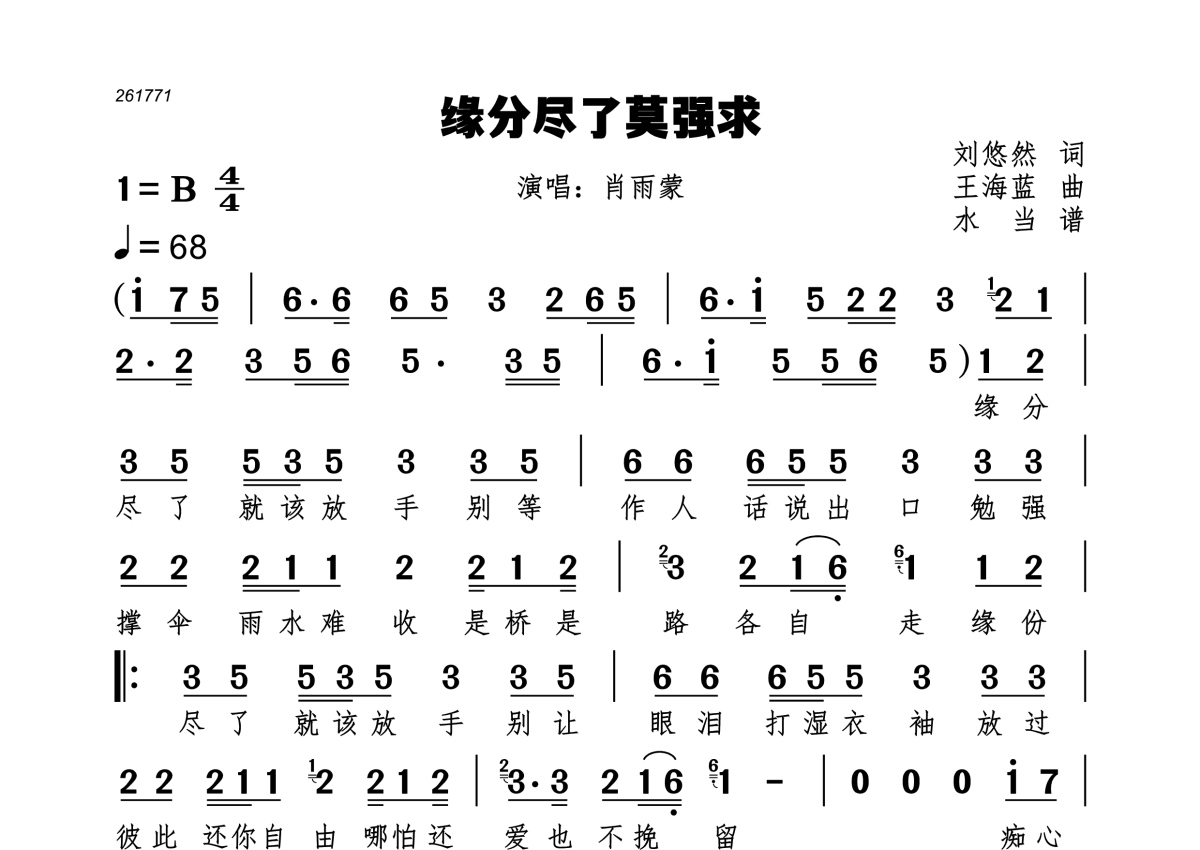 《缘分尽了莫强求》是肖雨蒙演唱的一首歌曲,拍号为4/4拍,歌曲速度为每分钟68拍,这份简谱共有一张高清图谱,图谱由 @水当 编配上传。