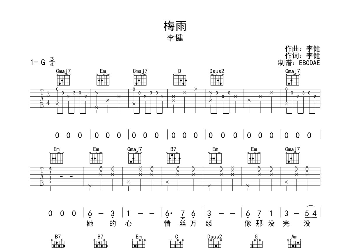 李健《梅雨》吉他谱 - G调弹唱六线谱