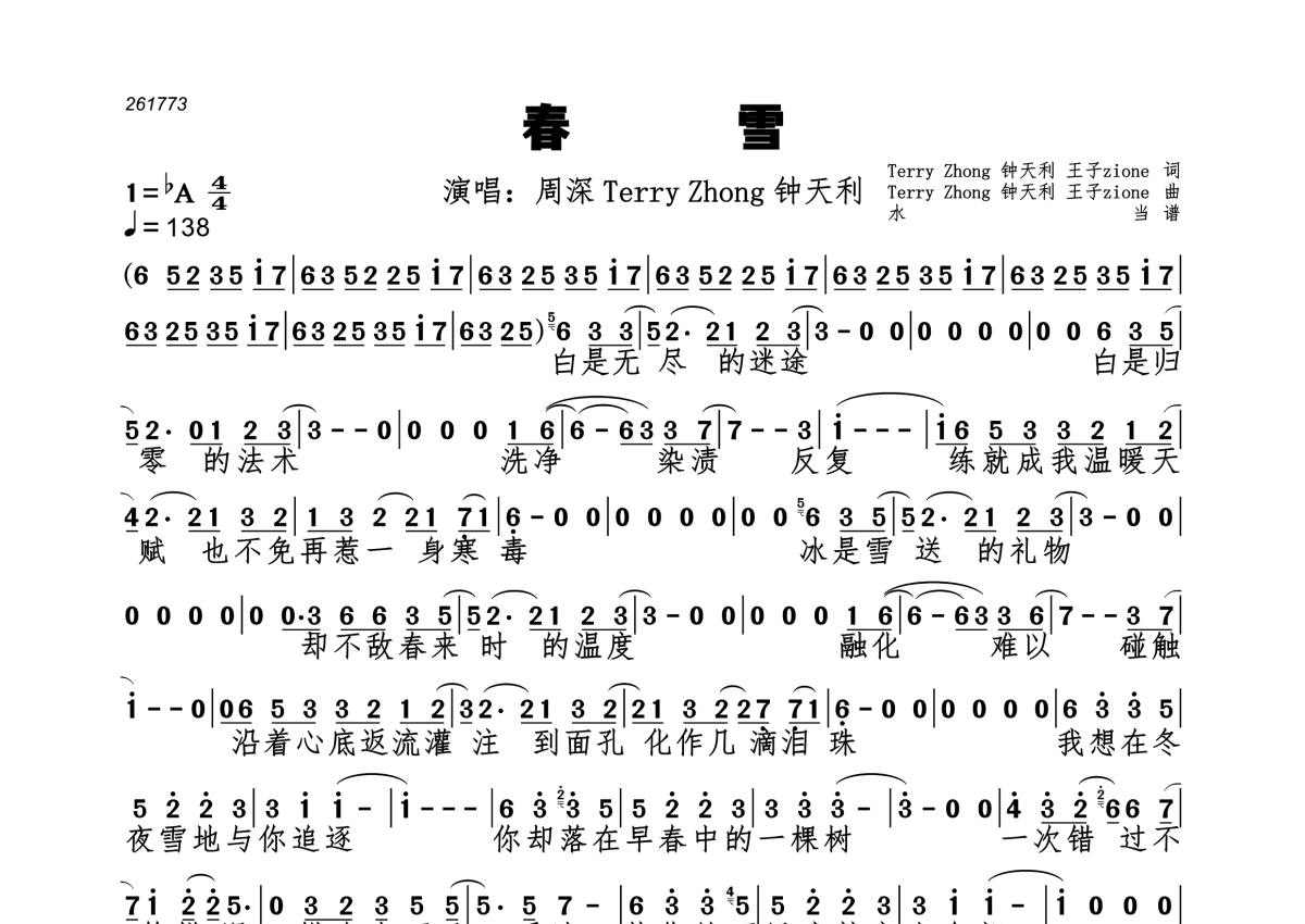 春雪简谱 - 周深&Terry Zhong 钟天利演唱