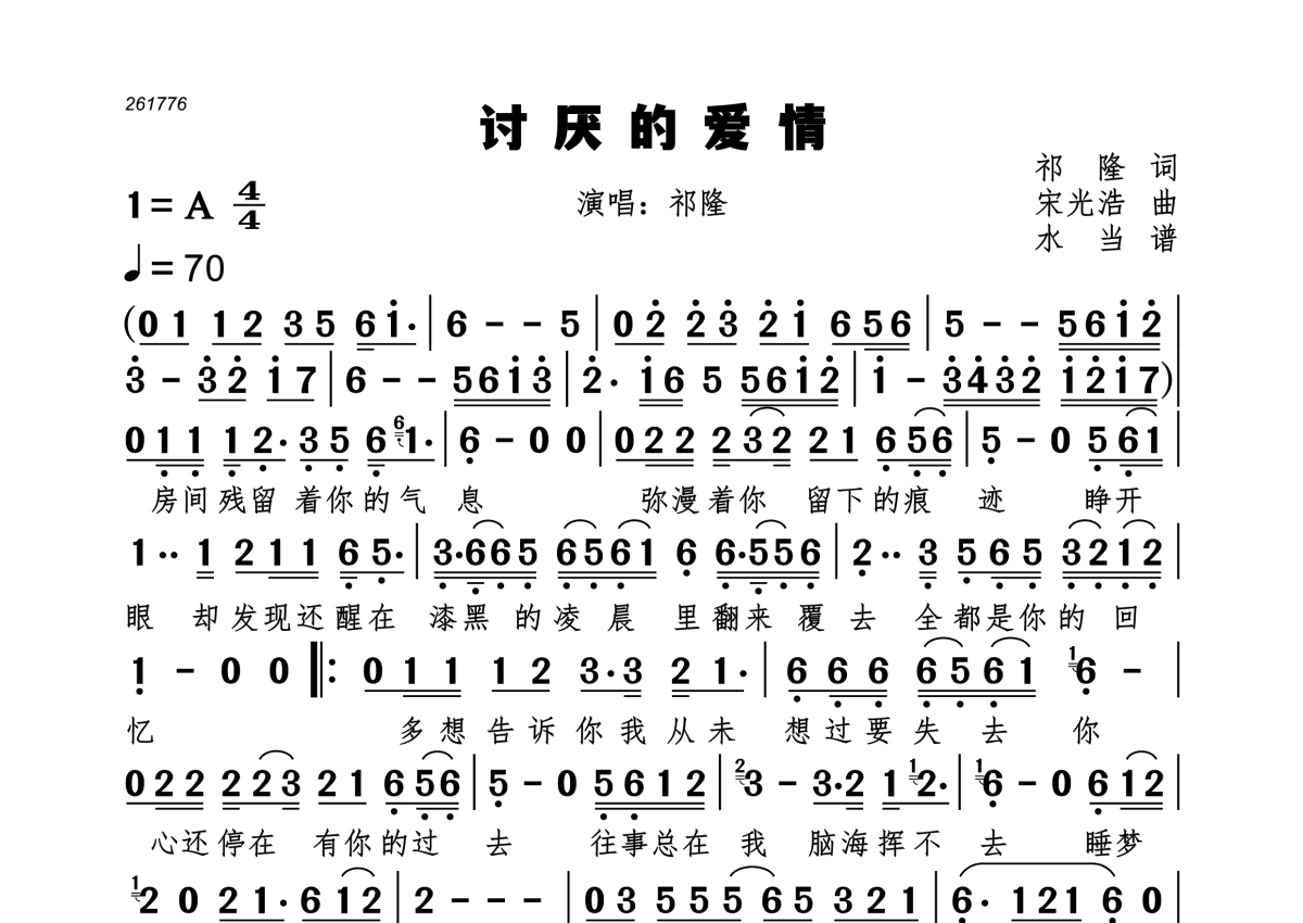 《讨厌的爱情》是祁隆演唱的一首歌曲,拍号为4/4拍,歌曲速度为每分钟70拍,这份简谱共有一张高清图谱,图谱由 @水当 编配上传。