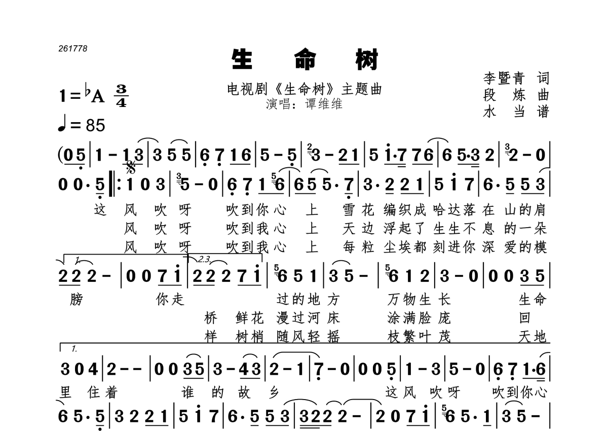 《生命树》是谭维维演唱的一首歌曲,拍号为4/4拍,歌曲速度为每分钟85拍,这份简谱共有一张高清图谱,图谱由 @水当 编配上传。
