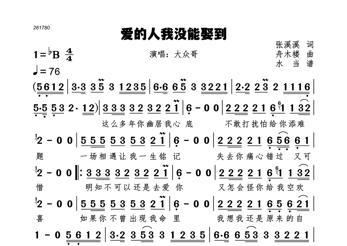 《爱的人我没能娶到》是大众哥演唱的一首歌曲,拍号为4/4拍,歌曲速度为每分钟76拍,这份简谱共有一张高清图谱,图谱由 @水当 编配上传。