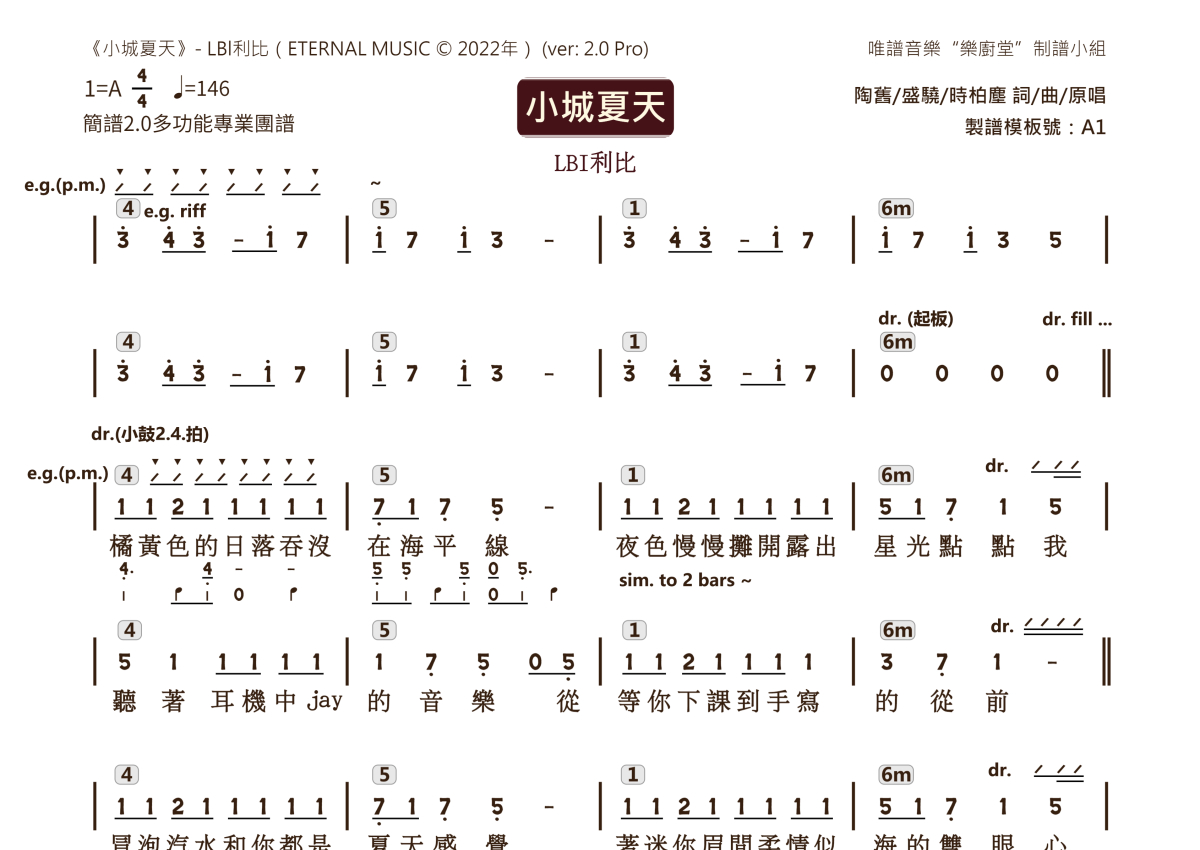 《小城夏天》是lbi利比演唱的一首歌曲,2.0版多功能团谱,这份乐队总谱共有两张高清图谱,图谱由 @唯谱音乐"乐厨堂"发布小组 编配上传。