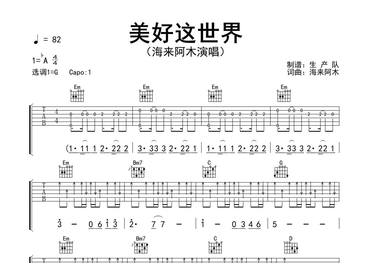 《美好新世界》是海来阿木演唱的一首歌曲,精编完美版,拍号为4/4拍,歌曲速度为每分钟82拍,歌曲原调为Ab调,但由于原调指法比较难,为了方便弹奏,本吉他谱采用的是G调指法编配,变调夹1品弹奏即为原调,当然也可以根据自己的音域改变变调夹位置,或者通过改变和弦调性,以方便自己弹奏,这份吉他谱共有三张高清图谱,图谱由 @生产队 编配上传,图谱使用六线谱编配,包含吉他和弦指法、简谱以及歌词部分,使用这份美好新世界吉他谱,可以让你更加方便地掌握这首歌曲的弹唱技巧,快来尝试吧。海来阿木作词、作曲并演唱的歌曲《美好新世界》原版吉他谱,含精准的前奏、间奏、尾奏solo编配,精编完美版,优质推荐!。