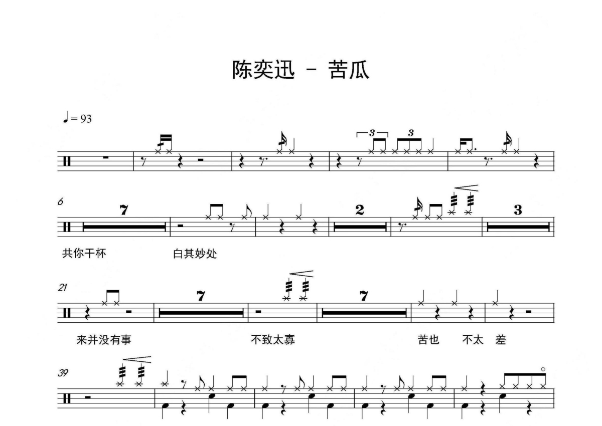 《苦瓜》是陈奕迅演唱的一首歌曲,拍号为4/4拍,歌曲速度为每分钟93拍,这份架子鼓谱共有两张高清图谱,图谱由 @音符喷血者 编配上传,图谱使用五线谱编配,使用这份苦瓜架子鼓谱,你将能够轻松地敲打出这首陈奕迅的苦瓜,快来尝试吧。