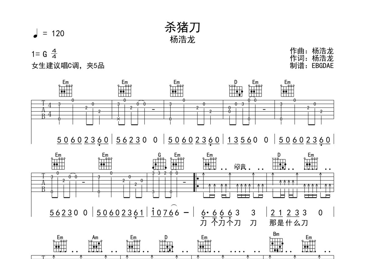 杨浩龙《杀猪刀》吉他谱 - G调弹唱六线谱