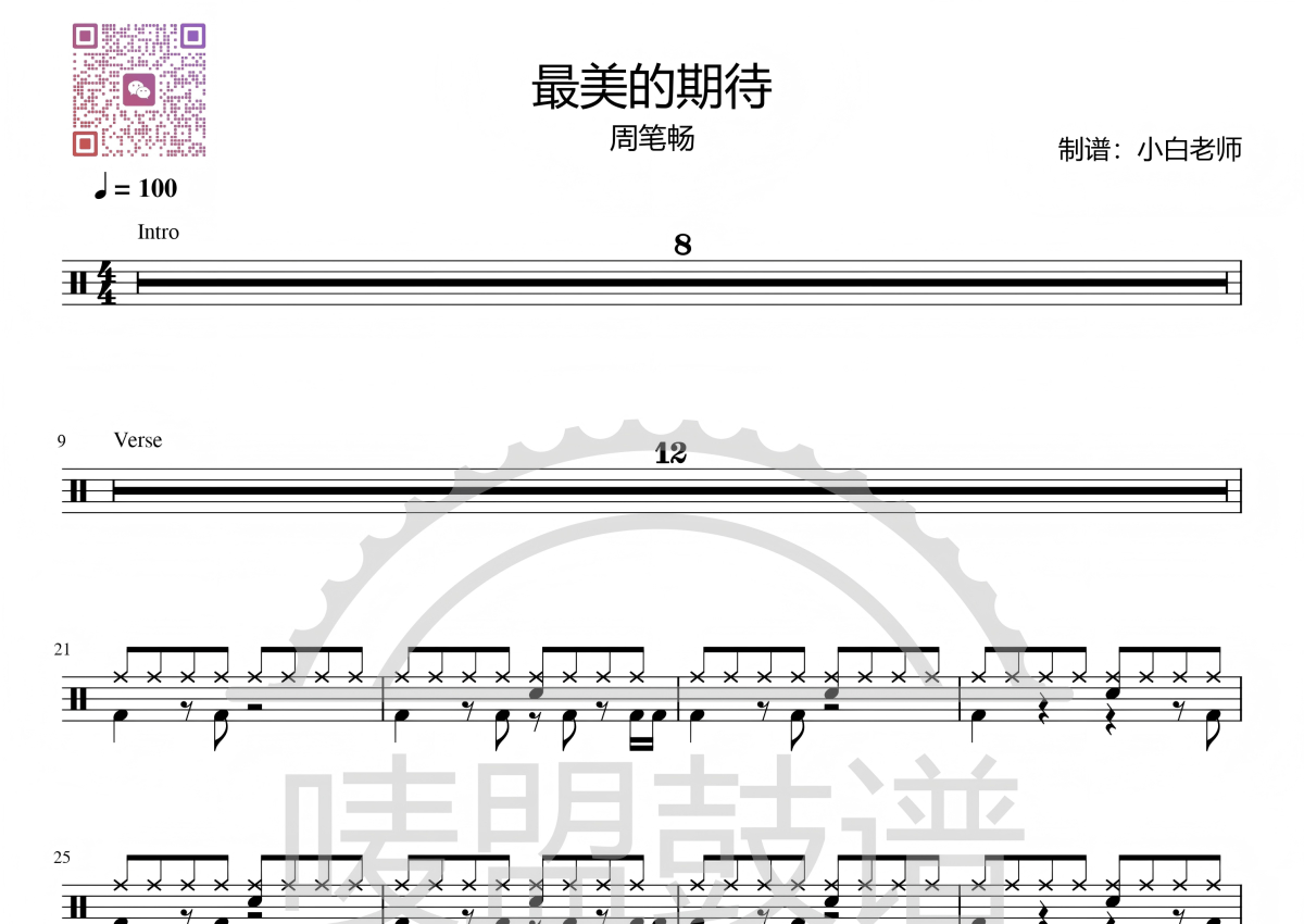 《最美的期待》是张杰演唱的一首歌曲,拍号为4/4拍,这份架子鼓谱共有三张高清图谱,图谱由 @苏小白 编配上传,图谱使用五线谱编配,使用这份最美的期待架子鼓谱,你将能够轻松地敲打出这首张杰的最美的期待,快来尝试吧。