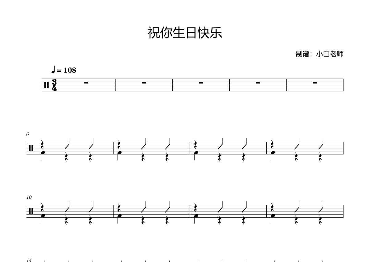 《祝你生日快乐》是儿歌演唱的一首歌曲,拍号为3/4拍,这份架子鼓谱共有一张高清图谱,图谱由 @苏小白 编配上传,图谱使用五线谱编配,使用这份祝你生日快乐架子鼓谱,你将能够轻松地敲打出这首儿歌的祝你生日快乐,快来尝试吧。