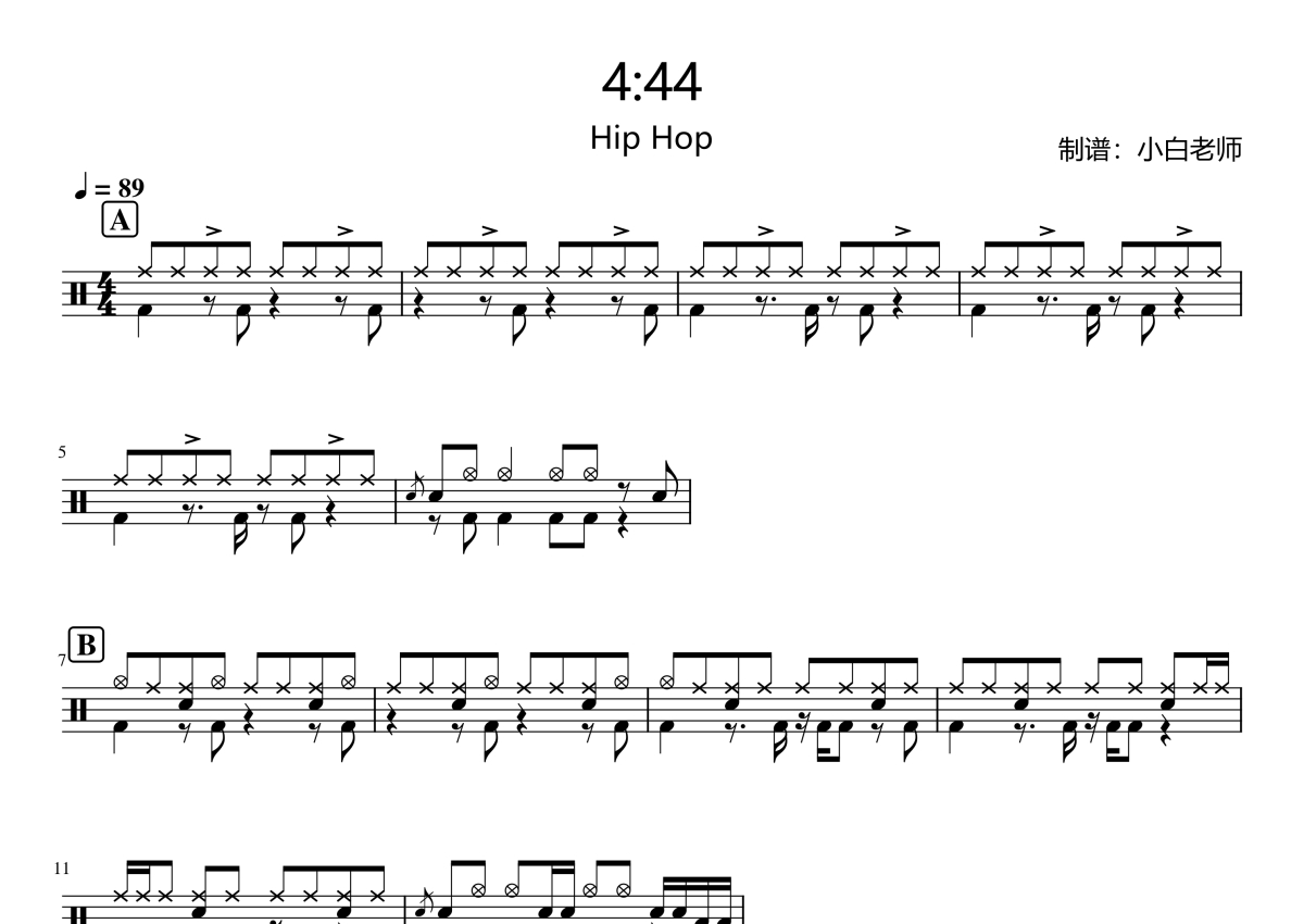 《4:44》是Hip Hop演唱的一首歌曲,拍号为4/4拍,歌曲速度为每分钟89拍,这份架子鼓谱共有三张高清图谱,图谱由 @苏小白 编配上传,图谱使用五线谱编配,使用这份4:44架子鼓谱,你将能够轻松地敲打出这首Hip Hop的4:44,快来尝试吧。