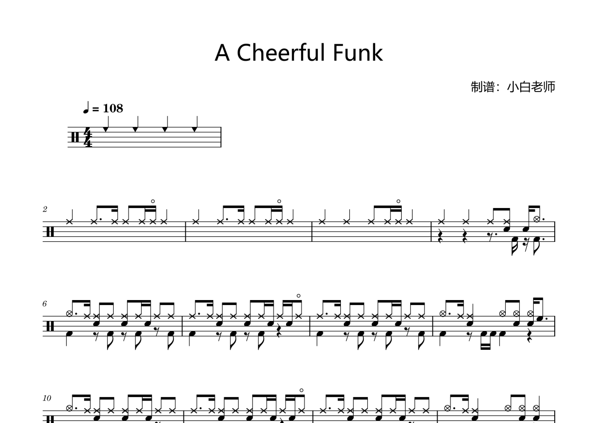 《A Cheerful Funk》是比赛曲目中级演唱的一首歌曲,拍号为4/4拍,歌曲速度为每分钟108拍,这份架子鼓谱共有三张高清图谱,图谱由 @苏小白 编配上传,图谱使用五线谱编配,使用这份A Cheerful Funk架子鼓谱,你将能够轻松地敲打出这首比赛曲目中级的A Cheerful Funk,快来尝试吧。