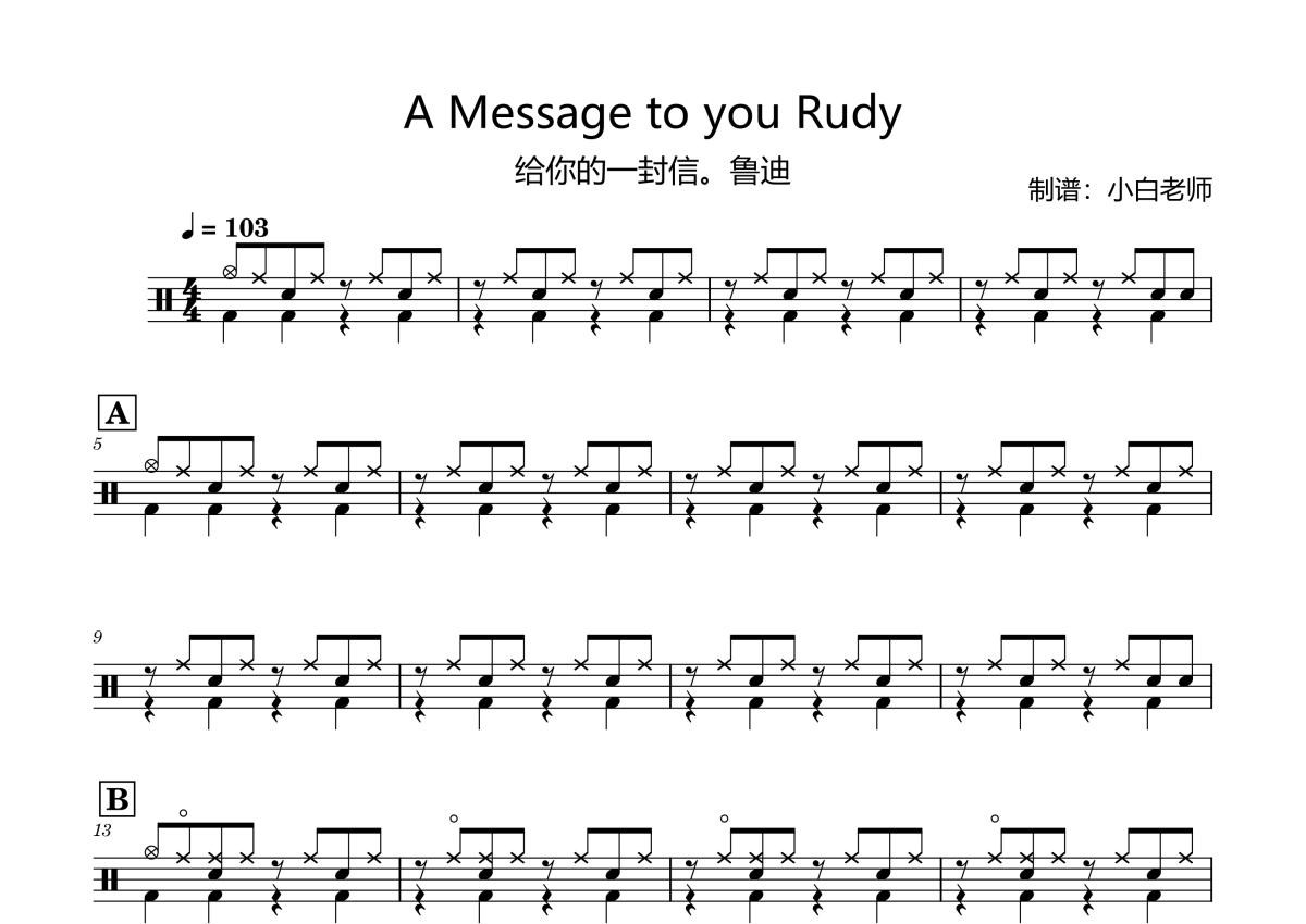 《A Message to you Rudy》是RSL考级曲目演唱的一首歌曲,拍号为4/4拍,歌曲速度为每分钟103拍,这份架子鼓谱共有一张高清图谱,图谱由 @苏小白 编配上传,图谱使用五线谱编配,使用这份A Message to you Rudy架子鼓谱,你将能够轻松地敲打出这首RSL考级曲目的A Message to you Rudy,快来尝试吧。