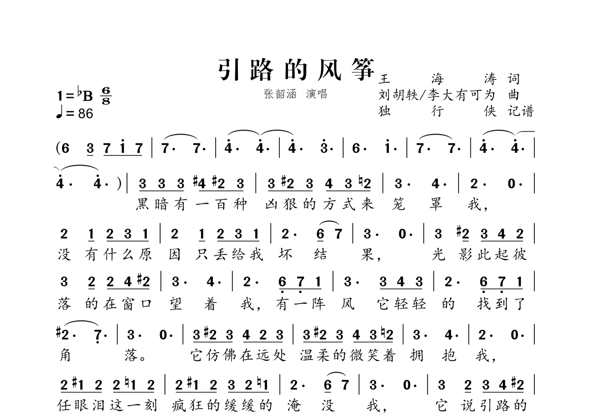 《引路的风筝》是张韶涵演唱的一首歌曲,拍号为6/8拍,歌曲速度为每分钟86拍,这份简谱共有两张高清图谱,图谱由 @独行侠 编配上传。