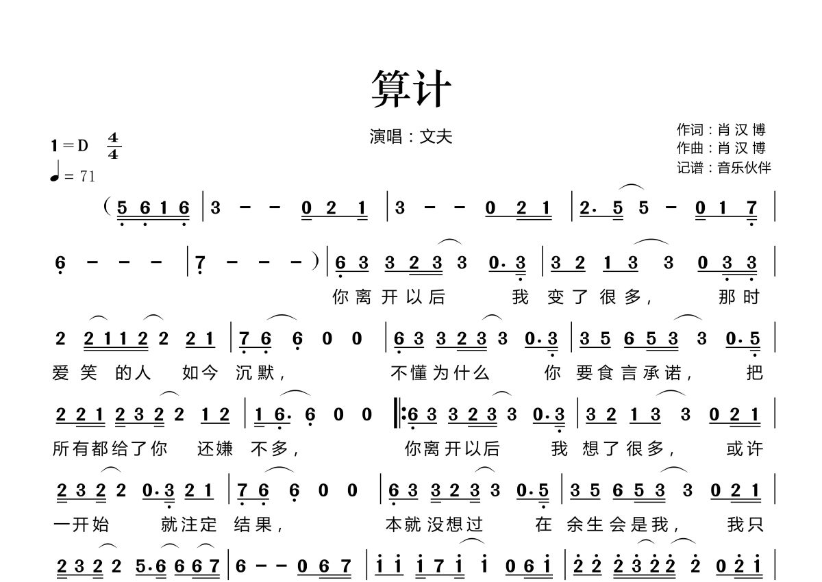 《算计》是文夫演唱的一首歌曲,拍号为4/4拍,歌曲速度为每分钟71拍,这份简谱共有一张高清图谱,图谱由 @音乐伙伴 编配上传。