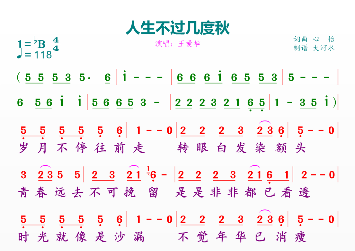 《人生不过几度秋》是王爱华演唱的一首歌曲,拍号为4/4拍,歌曲速度为每分钟118拍,这份简谱共有一张高清图谱,图谱由 @临海雪原 编配上传。