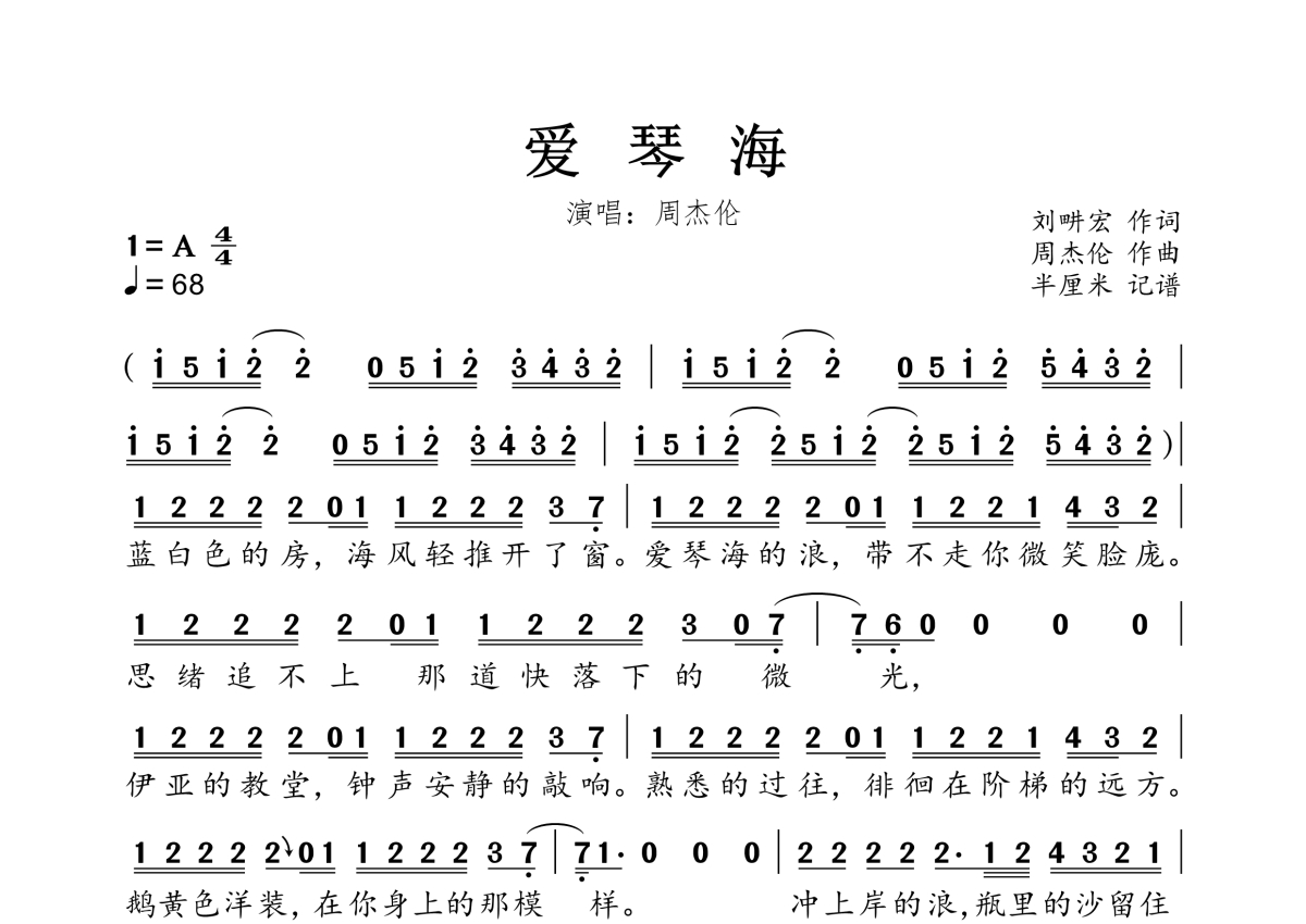 爱琴海简谱 - 周杰伦演唱