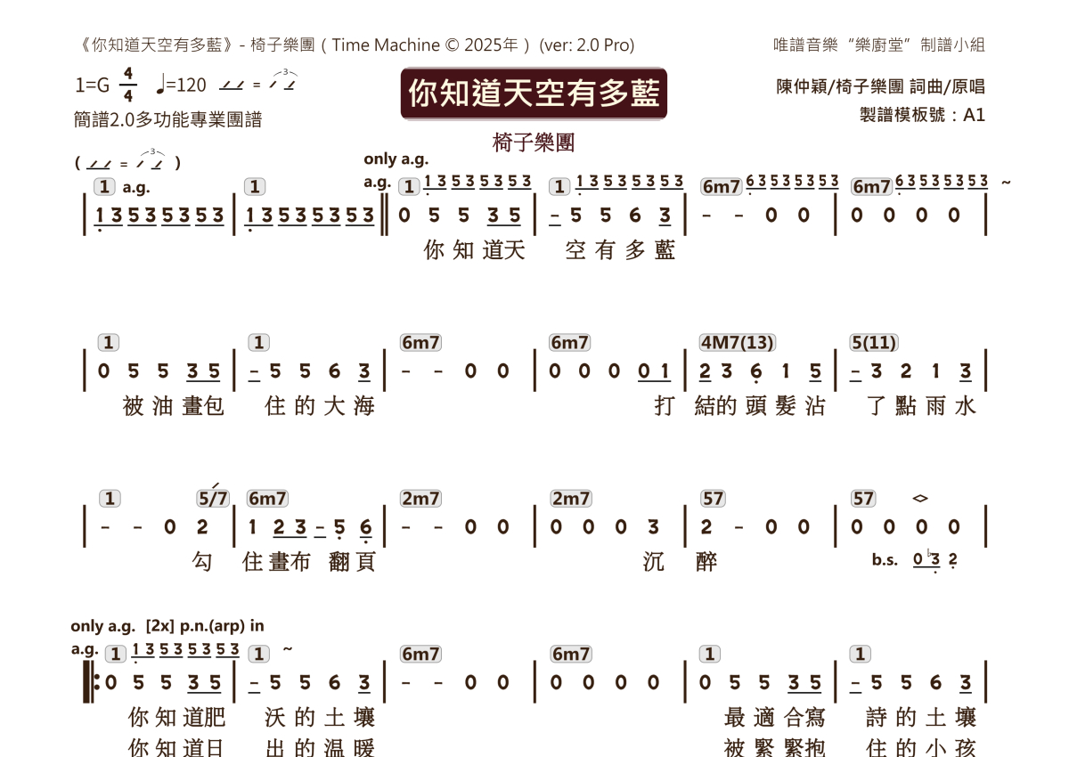 “乐厨堂”乐谱发布小组: 出版级乐谱扒谱制谱——以职业乐手圈通行标准记谱,遵循原版和声、伴奏元素和段落结构。 ❶ 2.0多功能专业团谱:采用台湾卓著公司开创的二代简谱标准制作。二代简谱无疑是迄今为止最科学、最易读的专业范畴多功能记谱方案:❷ 框架谱:采用职业乐手通常记谱方案制作。