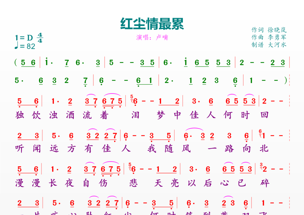 《红尘情最累》是卢喃演唱的一首歌曲,拍号为4/4拍,歌曲速度为每分钟82拍,这份简谱共有一张高清图谱,图谱由 @临海雪原 编配上传。