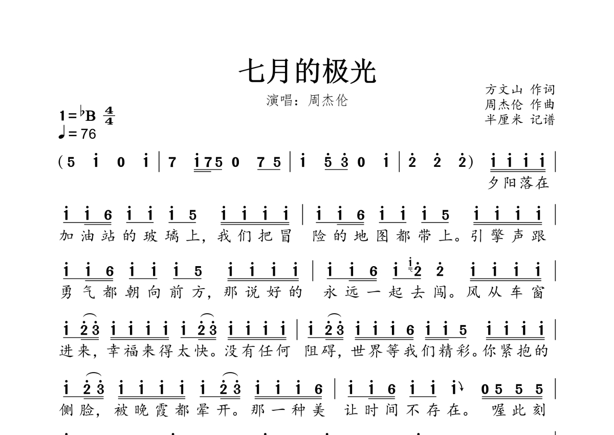 《七月的极光》是周杰伦演唱的一首歌曲,拍号为4/4拍,歌曲速度为每分钟76拍,这份简谱共有三张高清图谱,图谱由 @半厘米 编配上传。