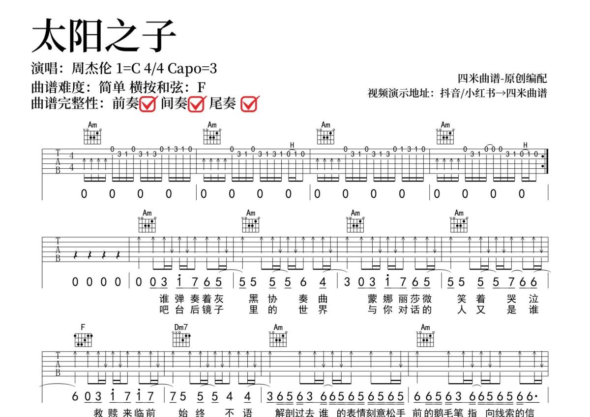 周杰伦《太阳之子》吉他谱 - C调弹唱六线谱