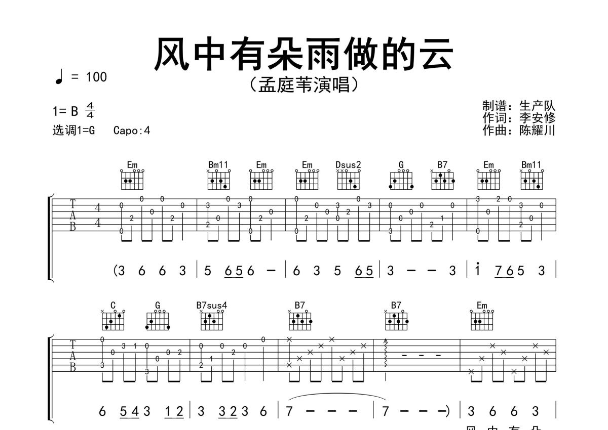 《风中有朵雨做的云》是孟庭苇演唱的一首歌曲,精编完美版,拍号为4/4拍,歌曲速度为每分钟100拍,歌曲原调为B调,但由于原调指法比较难,为了方便弹奏,本吉他谱采用的是G调指法编配,变调夹4品弹奏即为原调,当然也可以根据自己的音域改变变调夹位置,或者通过改变和弦调性,以方便自己弹奏,这份吉他谱共有三张高清图谱,图谱由 @生产队 编配上传,图谱使用六线谱编配,包含吉他和弦指法、简谱以及歌词部分,使用这份风中有朵雨做的云吉他谱,可以让你更加方便地掌握这首歌曲的弹唱技巧,快来尝试吧。孟庭苇演唱的歌曲《风中有朵雨做的云》原版吉他谱,含精准的前奏、间奏、尾奏solo编配,精编完美版,怀旧经典!。