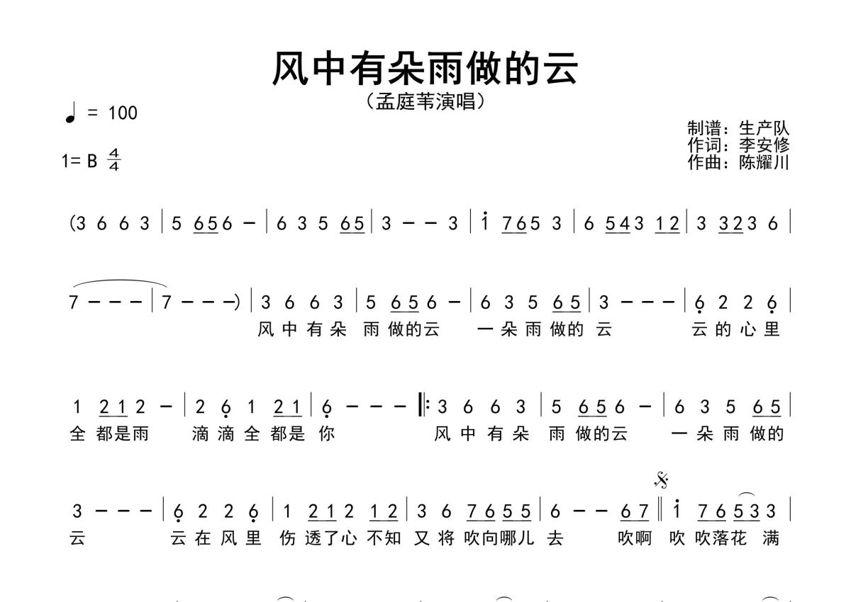 《风中有朵雨做的云》是孟庭苇演唱的一首歌曲,原版简谱,拍号为4/4拍,歌曲速度为每分钟100拍,这份简谱共有一张高清图谱,图谱由 @生产队 编配上传孟庭苇演唱的歌曲《风中有朵雨做的云》原版简谱,含精准的前奏、间奏、尾奏solo编配,精编完美版,怀旧经典!。