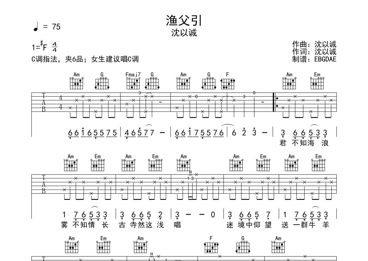 沈以诚《渔父引》吉他谱 - C调弹唱六线谱