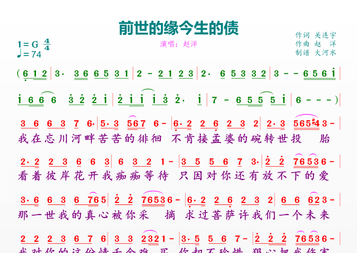 《前世的缘今生的债》是赵洋演唱的一首歌曲,拍号为4/4拍,歌曲速度为每分钟74拍,这份简谱共有一张高清图谱,图谱由 @临海雪原 编配上传。