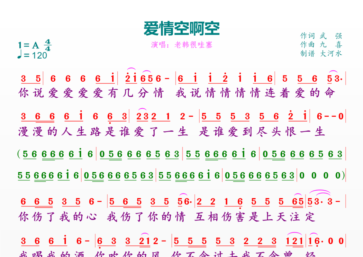 《爱情空啊空》是老韩很哇塞演唱的一首歌曲,拍号为4/4拍,歌曲速度为每分钟120拍,这份简谱共有一张高清图谱,图谱由 @临海雪原 编配上传。