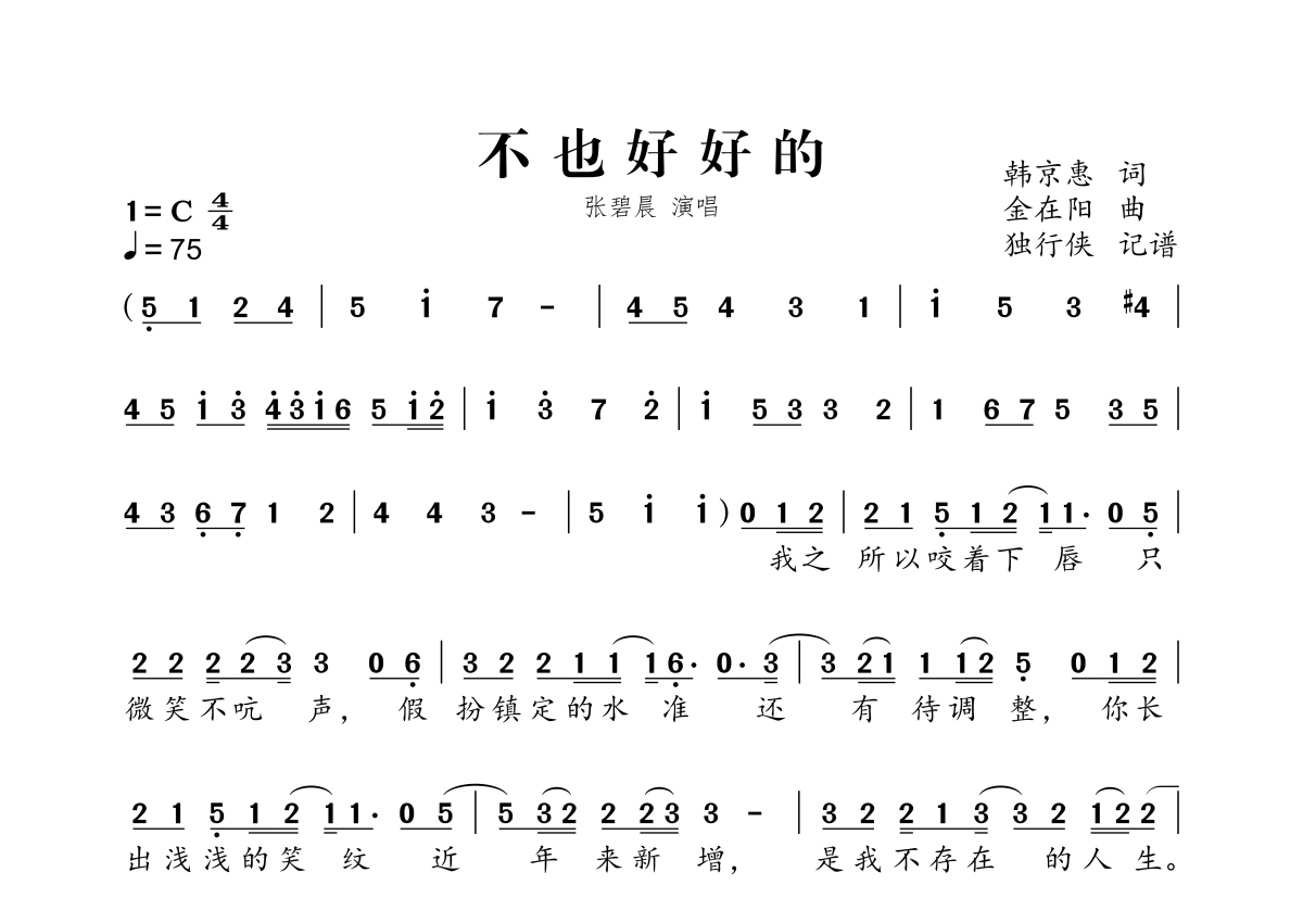 《不也好好的》是张碧晨演唱的一首歌曲,拍号为4/4拍,歌曲速度为每分钟75拍,这份简谱共有两张高清图谱,图谱由 @独行侠 编配上传。