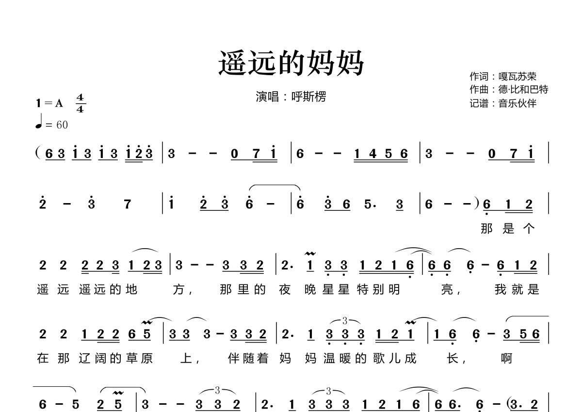 《遥远的妈妈》是呼斯楞演唱的一首歌曲,拍号为4/4拍,歌曲速度为每分钟60拍,这份简谱共有两张高清图谱,图谱由 @音乐伙伴 编配上传。