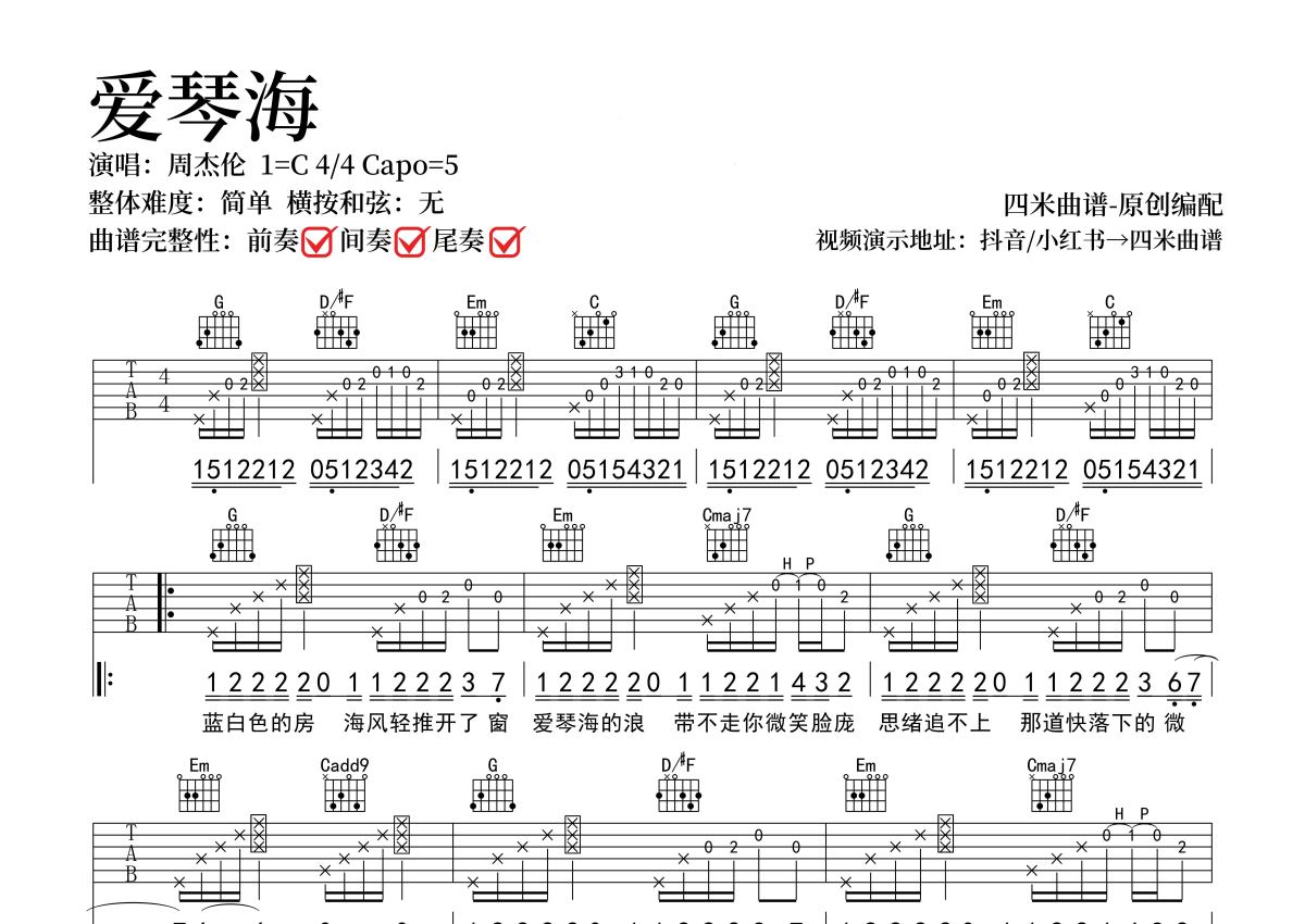 周杰伦《爱琴海》吉他谱 - G调弹唱六线谱