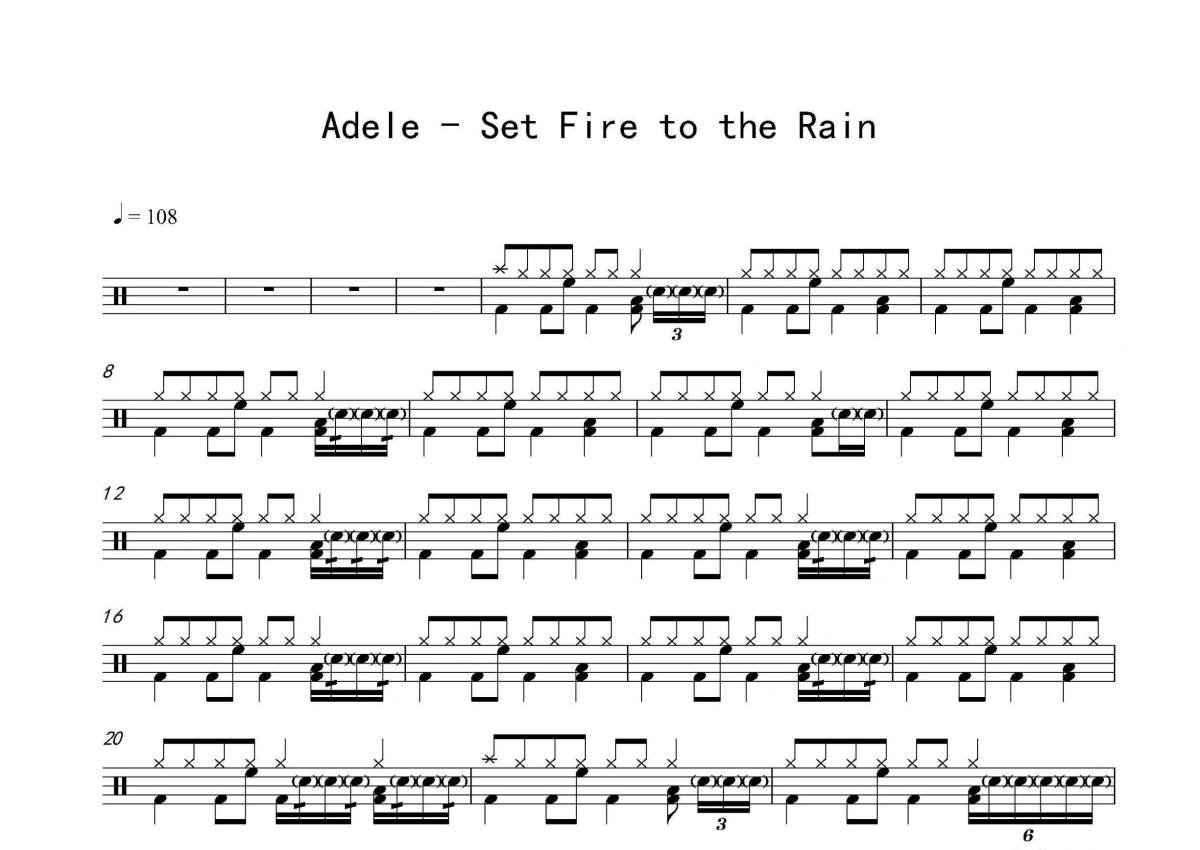 《Set Fire to the Rain》是Adele演唱的一首歌曲,拍号为4/4拍,歌曲速度为每分钟108拍,这份架子鼓谱共有两张高清图谱,图谱由 @音符喷血者 编配上传,图谱使用五线谱编配,使用这份Set Fire to the Rain架子鼓谱,你将能够轻松地敲打出这首Adele的Set Fire to the Rain,快来尝试吧。