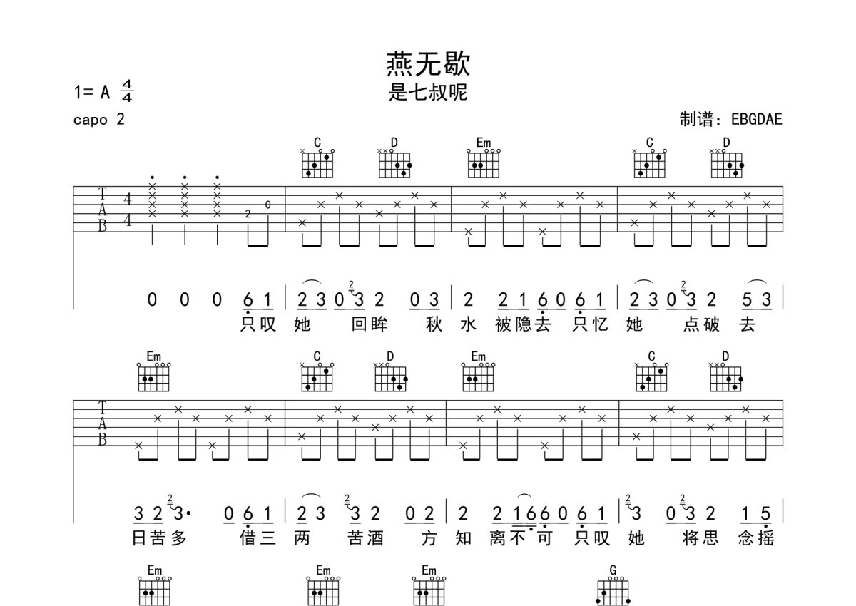 是七叔呢《燕无歇》吉他谱 - G调弹唱六线谱