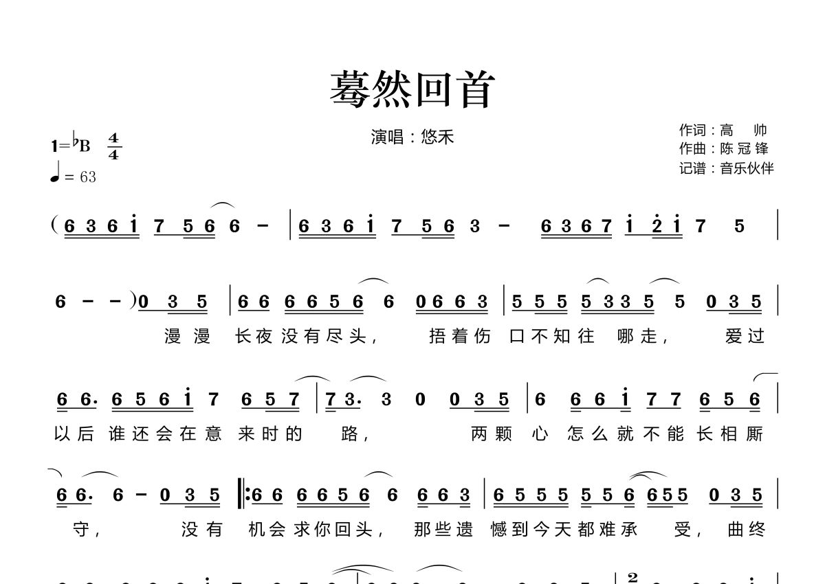 《蓦然回首》是悠禾演唱的一首歌曲,拍号为4/4拍,歌曲速度为每分钟63拍,这份简谱共有两张高清图谱,图谱由 @音乐伙伴 编配上传。